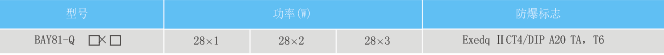 按照產品型號說明逐條選擇并注明防爆標志,例如:需要雙管28W吊桿式1安裝,則產品選型為BAY81-Q28×2g1 Exedq ⅡCT4/DIP A20 TA,T6