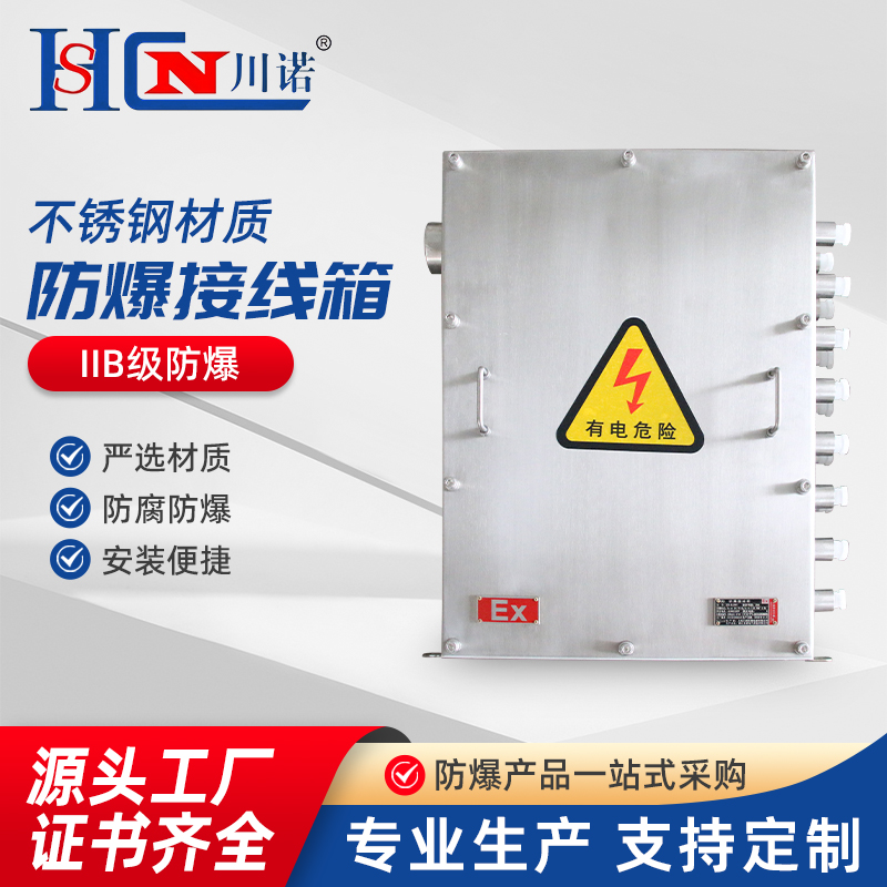 BJX系列防爆接線箱(以下簡稱接線箱),適用于II類、B級、C級T6組以下級別組別的含有爆炸性氣體混合物的場所中,在交流50Hz、額定電壓380V、額定電流至200A以下電路,作為連接各種電氣設備接線、分線使用。