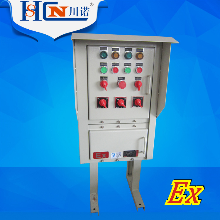 A、外殼采用鑄鋁合金壓鑄成型,表面噴塑。主腔采用隔爆型結構,接線腔增安型結構。內可選配裝斷路器、交流接觸器、熱繼電器、Ex防爆控制按鈕、Ex防爆信號燈等。配電箱采用模塊化設計,各種回路可以自由組合,電器元件選型可由用戶而定,其結構緊湊、外形美觀。進出線采用鋼管或電纜布線均可,進出線口方向可由用戶要求而定。